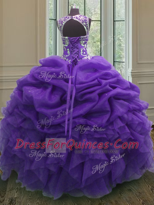Dramatic Organza Scoop Sleeveless Lace Up Beading and Ruffles and Pick Ups Quinceanera Dress in Purple