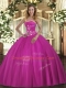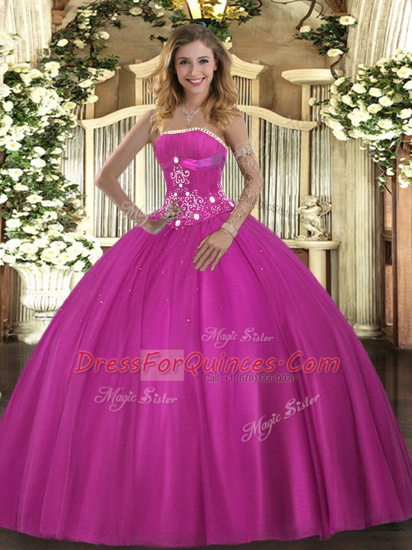Dramatic Tulle Strapless Sleeveless Lace Up Beading Sweet 16 Quinceanera Dress in Fuchsia