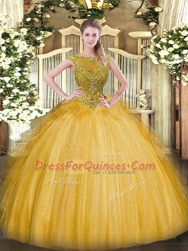 Elegant Scoop Sleeveless Zipper 15th Birthday Dress Gold Tulle
