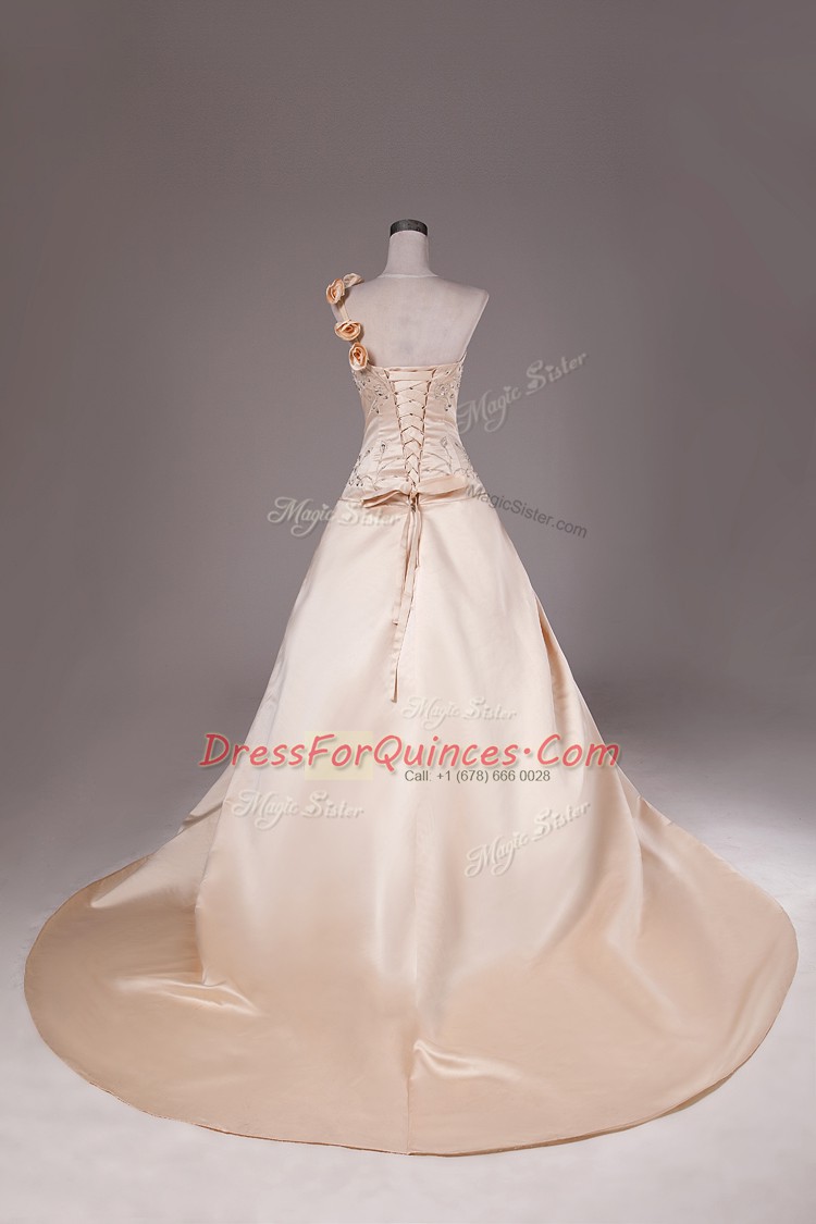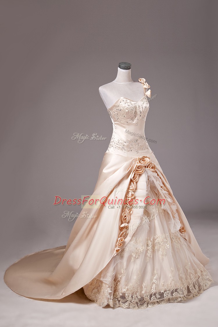 Enchanting Champagne Lace Up Ball Gown Prom Dress Embroidery and Hand Made Flower Sleeveless Brush Train