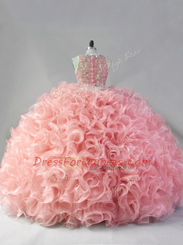 Fabric With Rolling Flowers Scoop Sleeveless Zipper Beading and Ruffles Quince Ball Gowns in Pink