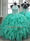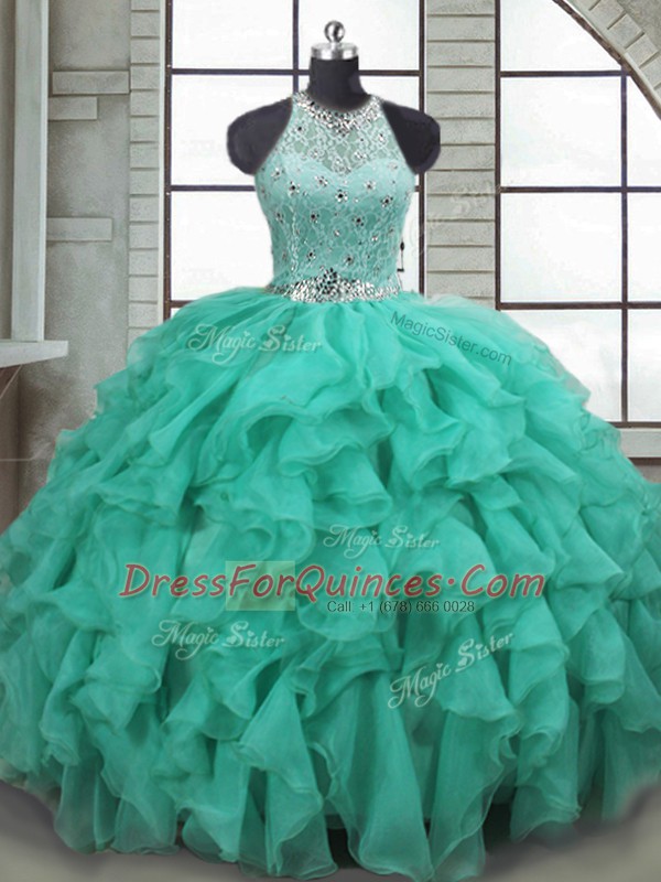 Fantastic Sleeveless Organza Brush Train Lace Up Quinceanera Dress in Turquoise with Beading and Ruffles