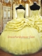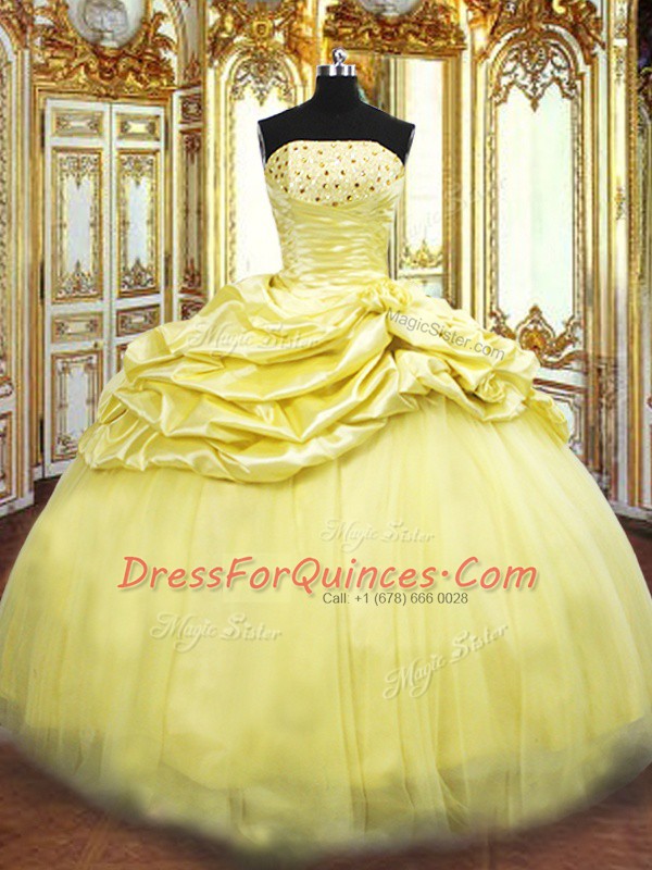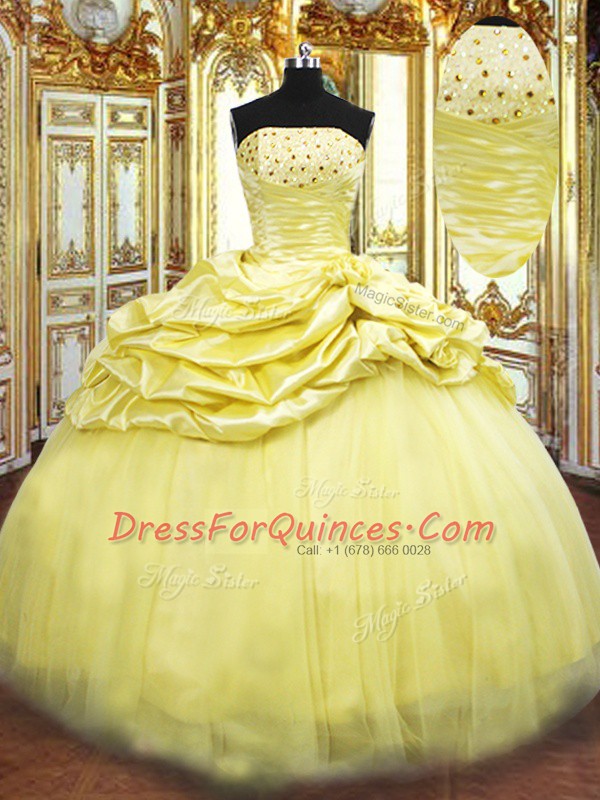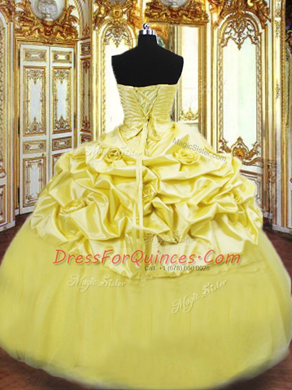 Fantastic Sleeveless Taffeta Floor Length Lace Up Sweet 16 Dresses in Gold with Beading and Pick Ups