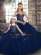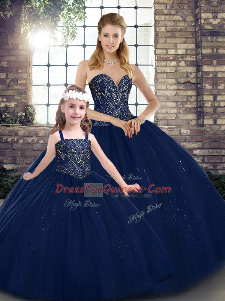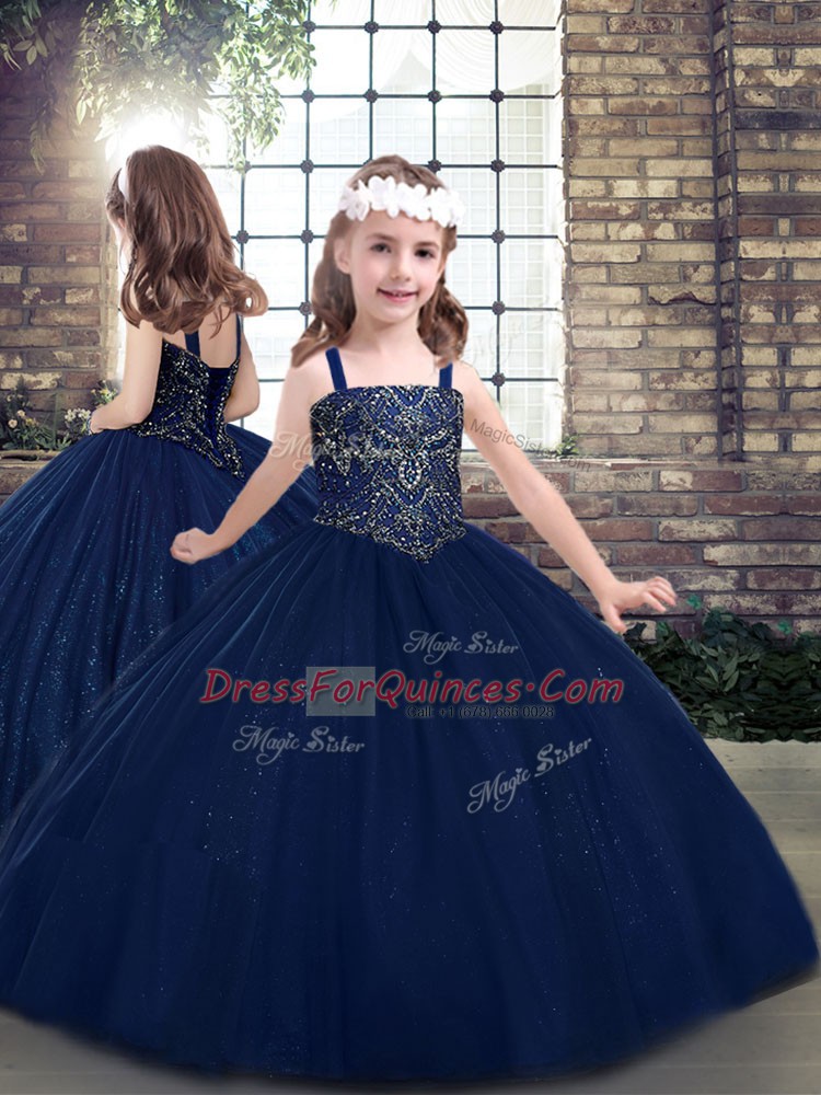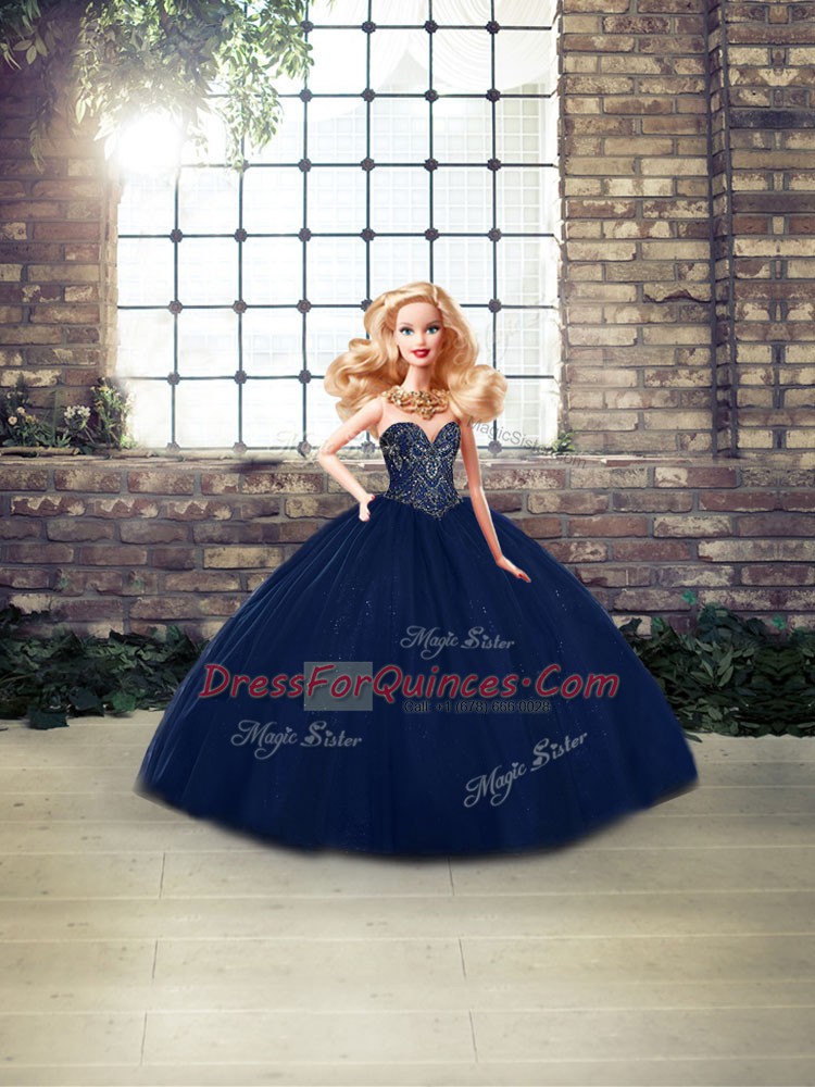 Flare Sleeveless Tulle Floor Length Lace Up Ball Gown Prom Dress in Navy Blue with Beading