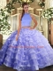 Floor Length Backless 15th Birthday Dress Lavender for Military Ball and Sweet 16 and Quinceanera with Beading and Ruffled Layers