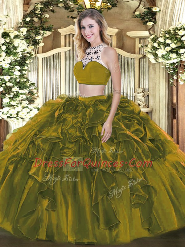 Floor Length Backless Sweet 16 Dress Olive Green for Military Ball and Sweet 16 and Quinceanera with Beading and Ruffles