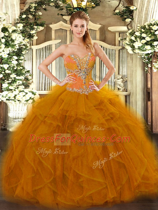 Floor Length Brown Ball Gown Prom Dress Tulle Sleeveless Beading and Ruffles