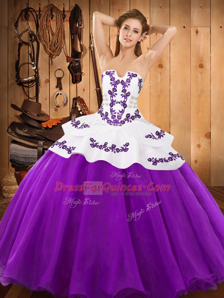Floor Length Lace Up Quinceanera Dress Eggplant Purple for Military Ball and Sweet 16 and Quinceanera with Embroidery