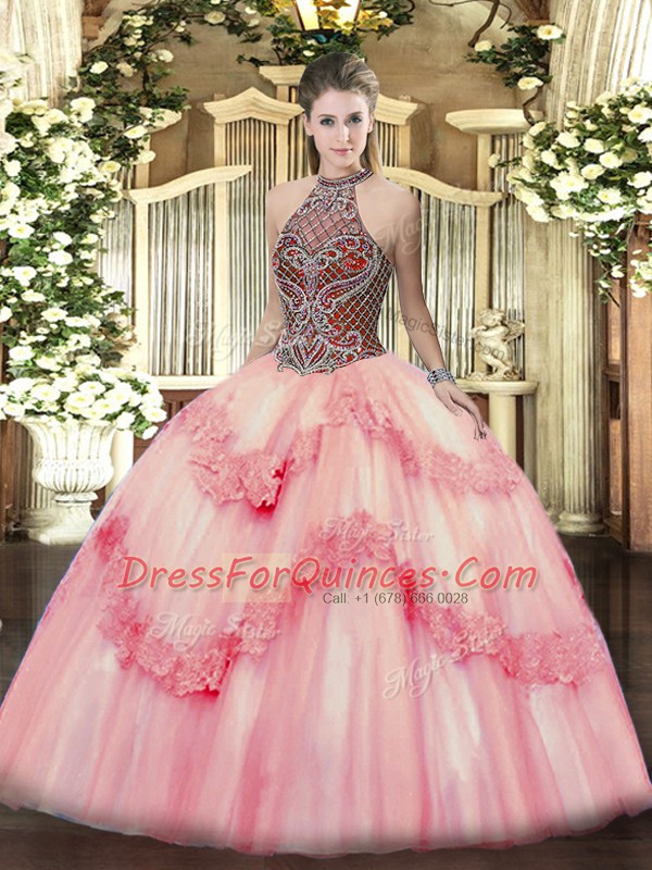 Glittering Pink Tulle Lace Up Sweet 16 Dresses Sleeveless Floor Length Beading and Appliques