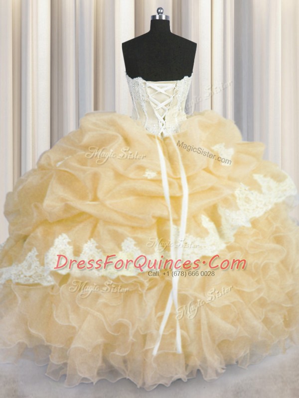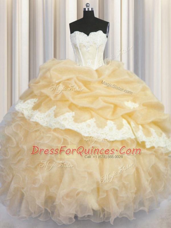 Gold Organza Lace Up Quinceanera Dress Sleeveless Floor Length Beading and Appliques and Ruffles and Pick Ups