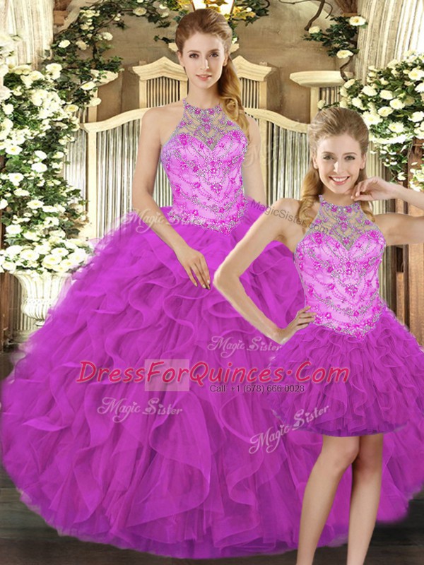 Gorgeous Three Pieces Quinceanera Gown Fuchsia Halter Top Tulle Sleeveless Floor Length Lace Up