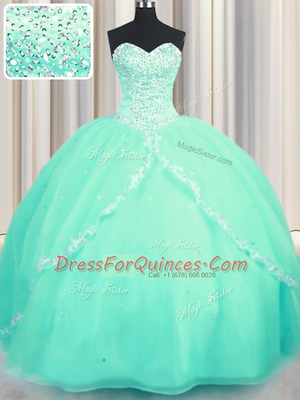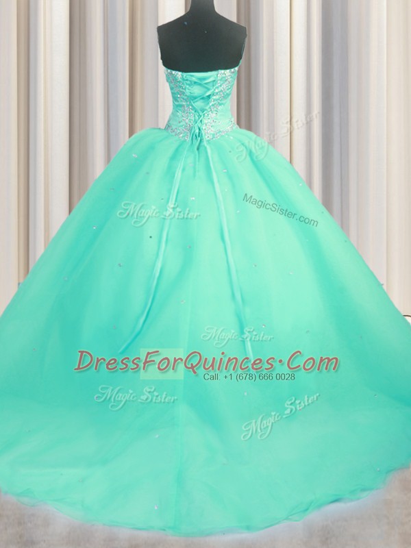 Great Turquoise Lace Up Sweetheart Beading and Appliques Vestidos de Quinceanera Organza Sleeveless Brush Train