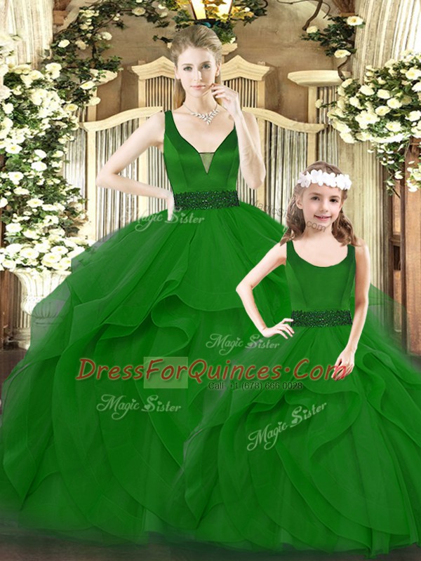 Green V-neck Zipper Ruffles Quinceanera Gown Sleeveless