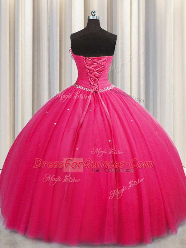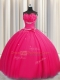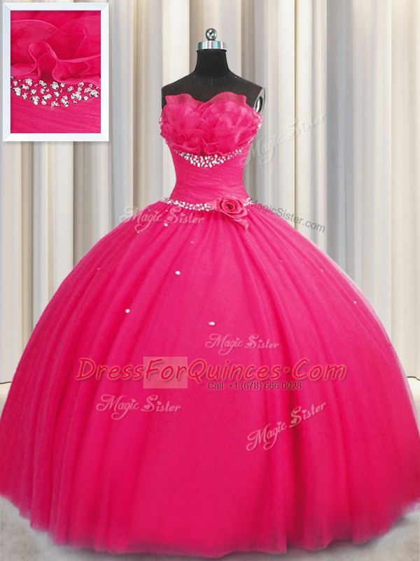 Handcrafted Flower Hot Pink Tulle Lace Up Quinceanera Dresses Sleeveless Floor Length Beading and Sequins and Hand Made Flower