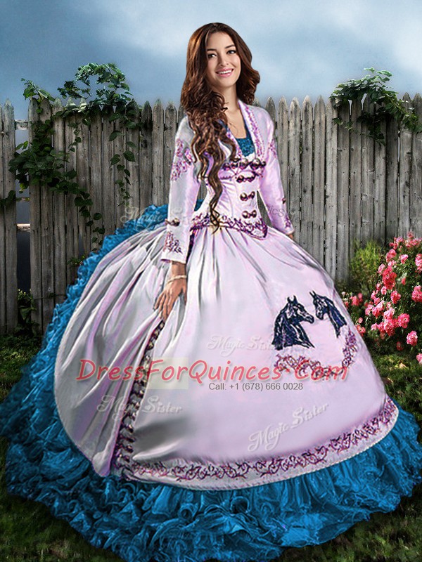 Ideal Blue And White Satin Lace Up Sweet 16 Dresses Sleeveless Floor Length Embroidery
