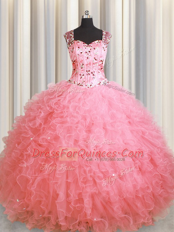 Latest See Through Zipper Up Pink Ball Gowns Beading and Ruffles Quinceanera Gowns Zipper Organza Sleeveless Floor Length