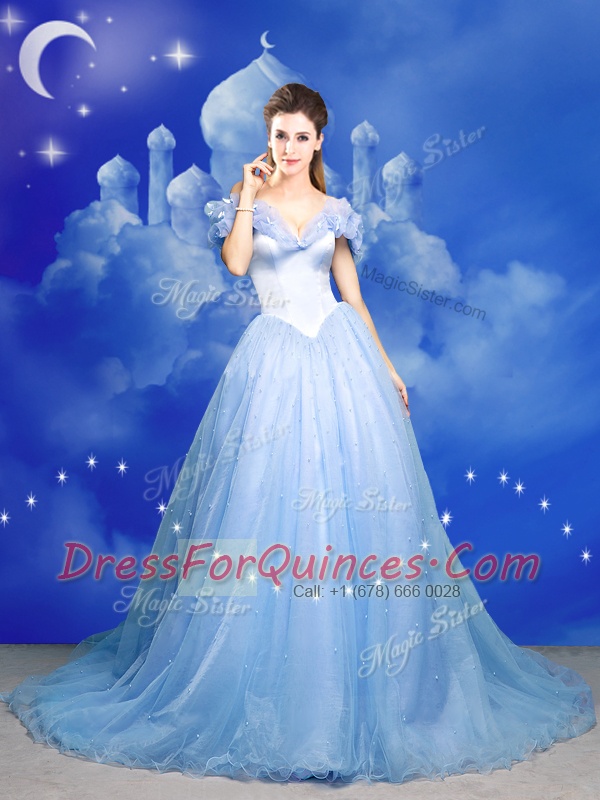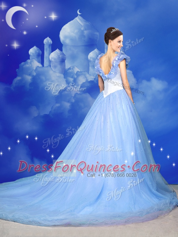 Light Blue Tulle Zipper Off The Shoulder Sleeveless With Train Quinceanera Gown Court Train Beading and Bowknot and Hand Made Flower