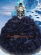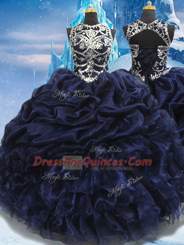 Navy Blue Ball Gowns High-neck Sleeveless Taffeta Floor Length Lace Up Appliques and Ruffles and Pick Ups Quinceanera Dress