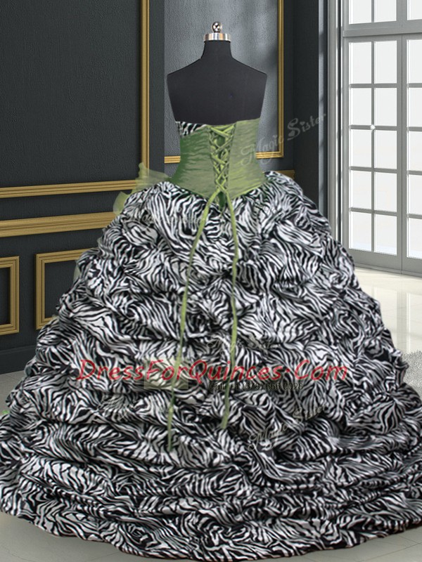 Olive Green Ball Gowns Beading and Ruffles and Pattern 15 Quinceanera Dress Lace Up Organza and Printed Sleeveless With Train