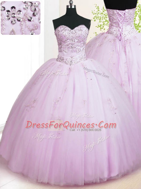 On Sale Lilac Tulle Lace Up Sweet 16 Dress Sleeveless Floor Length Beading and Appliques