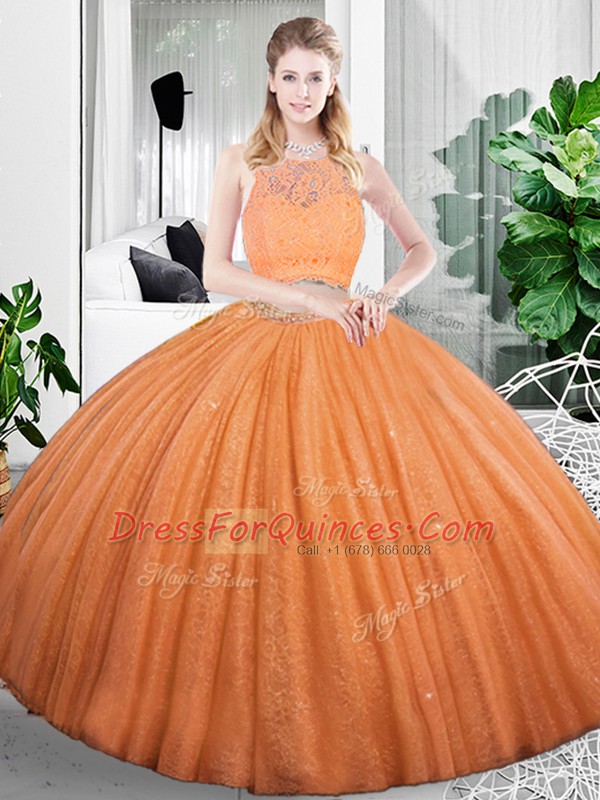 Orange Organza Zipper Scoop Sleeveless Floor Length Ball Gown Prom Dress Lace and Ruching