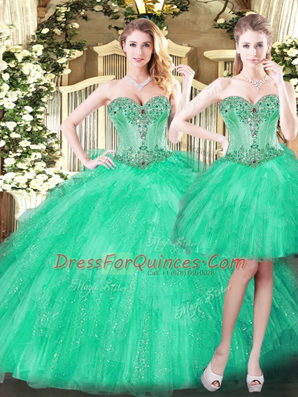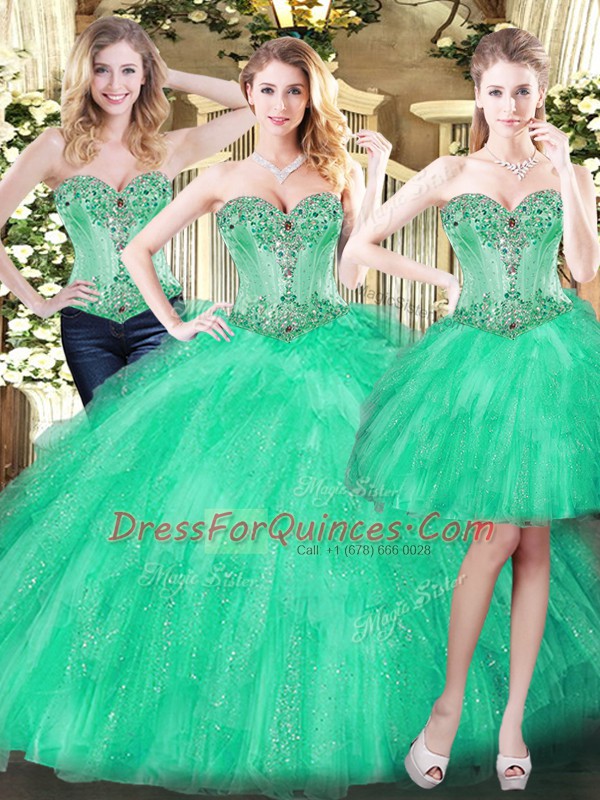 Pretty Floor Length Three Pieces Sleeveless Green Ball Gown Prom Dress Lace Up