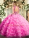 Rose Pink Backless High-neck Beading and Ruffled Layers Vestidos de Quinceanera Tulle Sleeveless