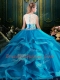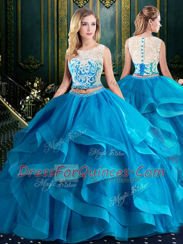 Scoop Baby Blue Tulle Zipper Quinceanera Gowns Sleeveless With Brush Train Lace and Ruffles