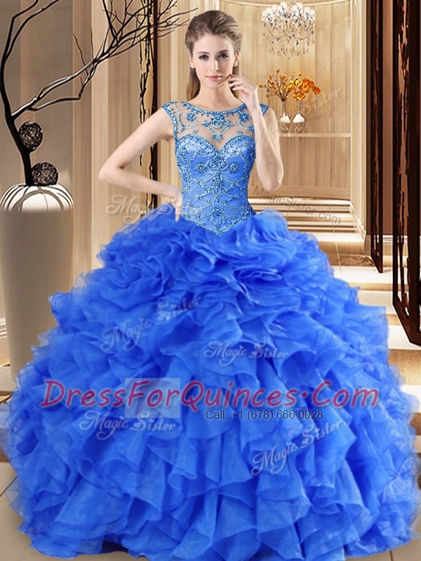 Scoop Royal Blue Lace Up 15 Quinceanera Dress Beading and Ruffles Sleeveless Floor Length
