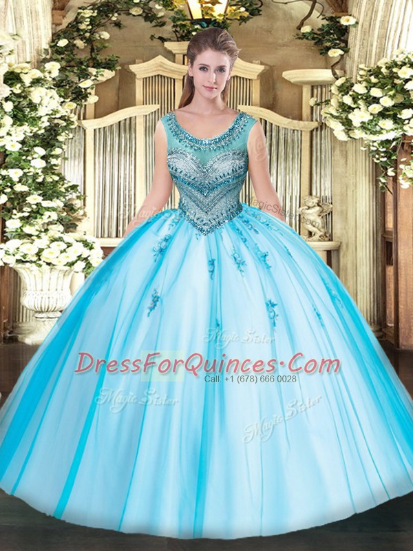 Scoop Sleeveless Tulle Quinceanera Gown Beading and Appliques Lace Up