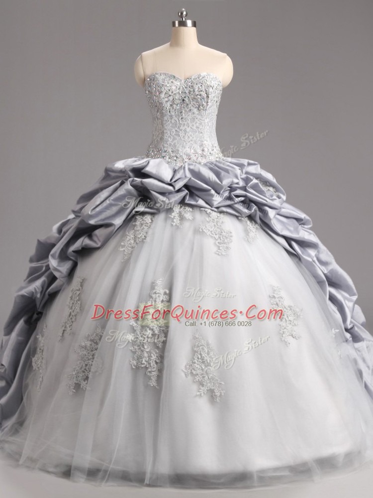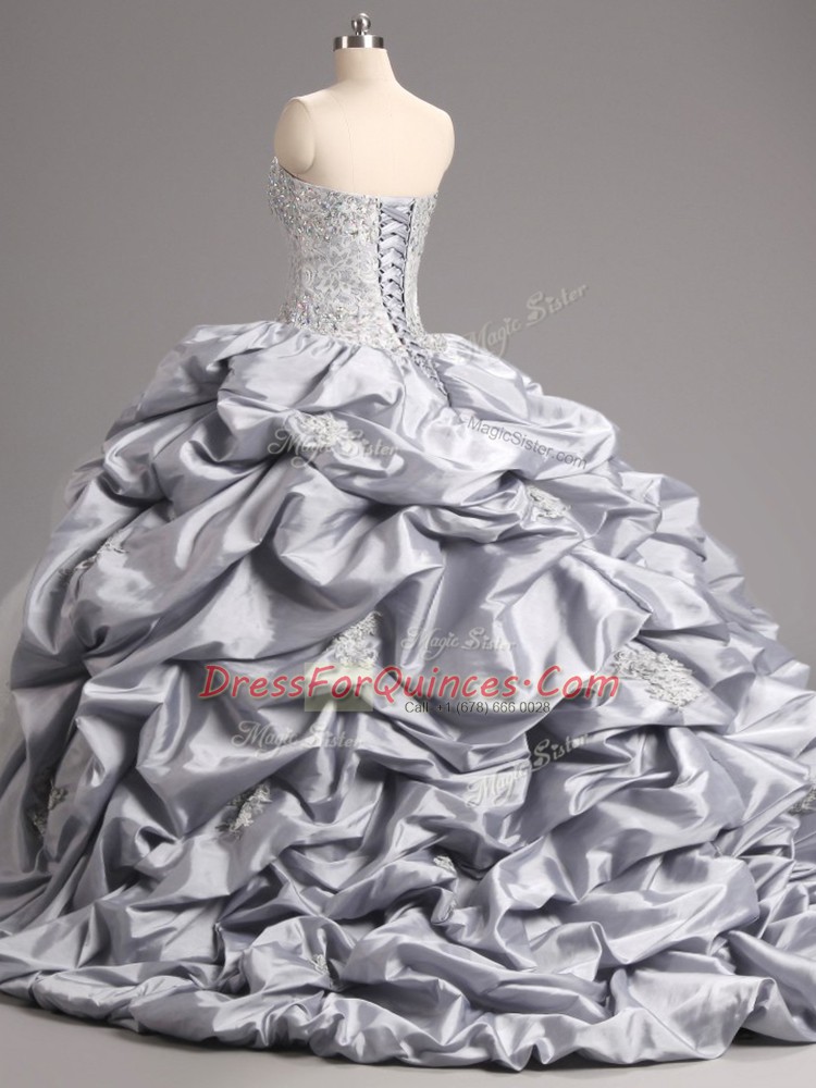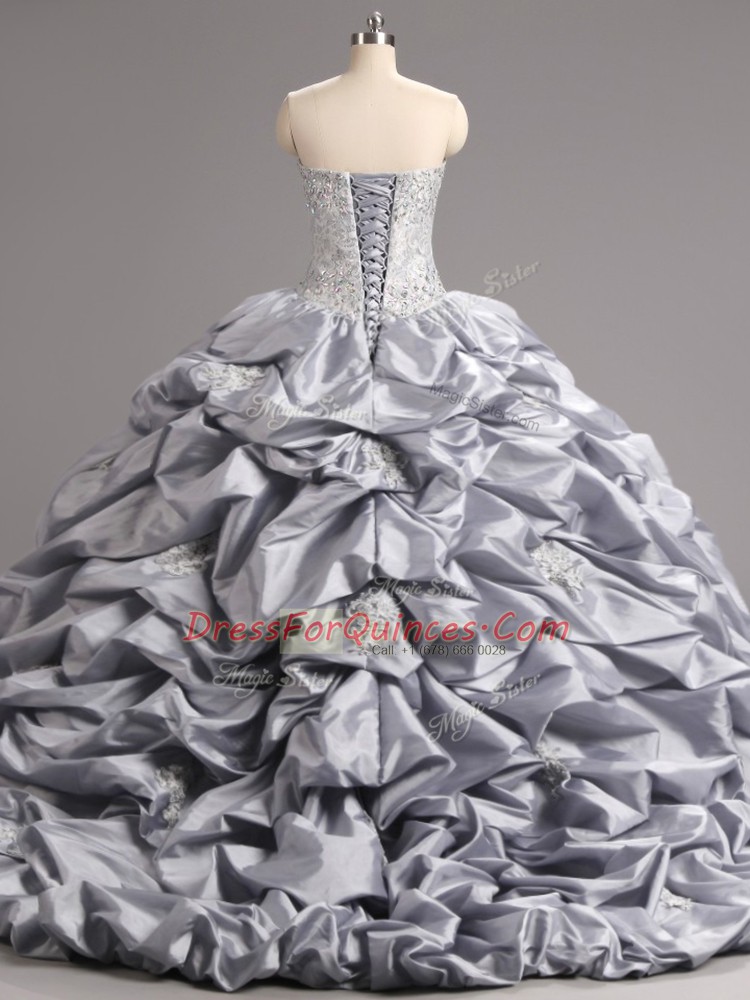 Sexy Taffeta and Tulle Sleeveless 15 Quinceanera Dress Brush Train and Beading and Appliques and Pick Ups