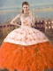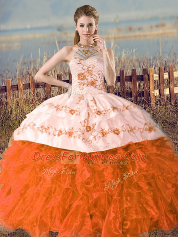 Sleeveless Embroidery Lace Up Quinceanera Dress with Orange and Rust Red Court Train