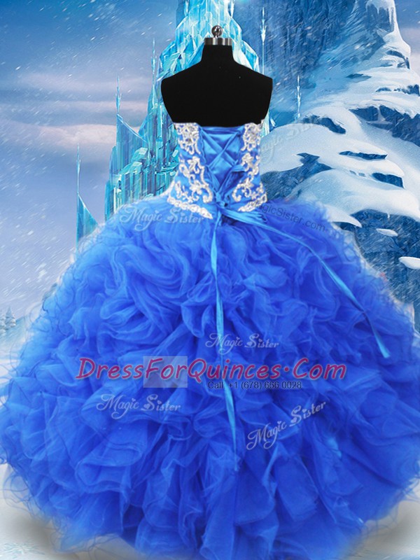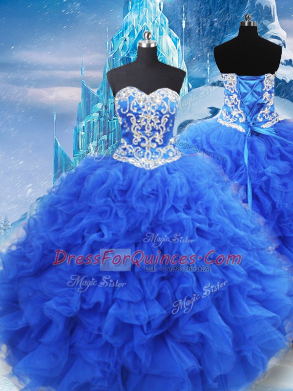 Sleeveless Floor Length Beading and Ruffles Lace Up Quinceanera Dresses with Blue