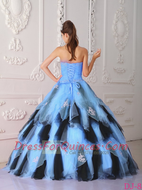 Strapless Ball Gown Applique Beadings A-line Taffeta and Organza Blue and Black 2014 Spring Quiceanera Dresses