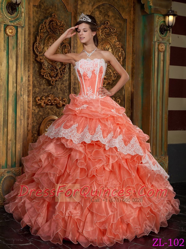 Strapless Ball Gown Orange Red Appliques Ruffles Organza Spring Quinceanera Dresses