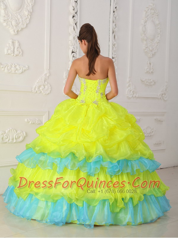 Strapless Ball Gown Organza Yellow Beadings and Ruffles Lace-up Spring Quinceanera Dresses