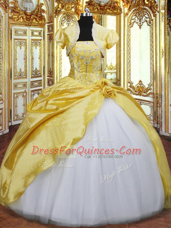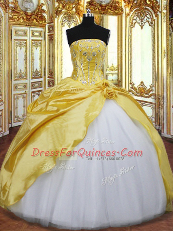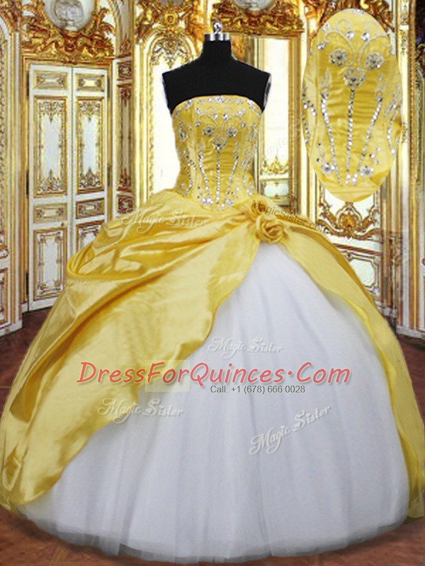 Stylish Floor Length Lace Up Quinceanera Dresses Gold for Military Ball and Sweet 16 and Quinceanera with Beading and Hand Made Flower