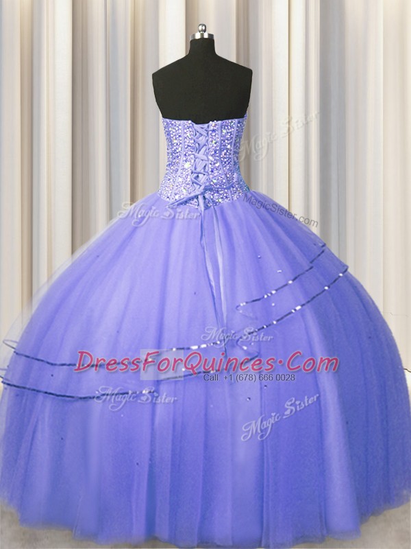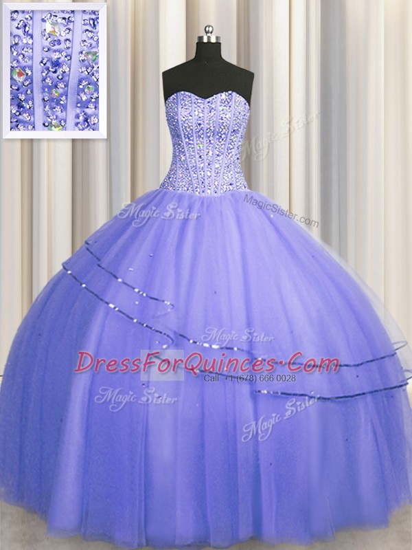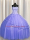 Sweet Visible Boning Puffy Skirt Purple Lace Up Vestidos de Quinceanera Beading Sleeveless Floor Length