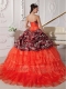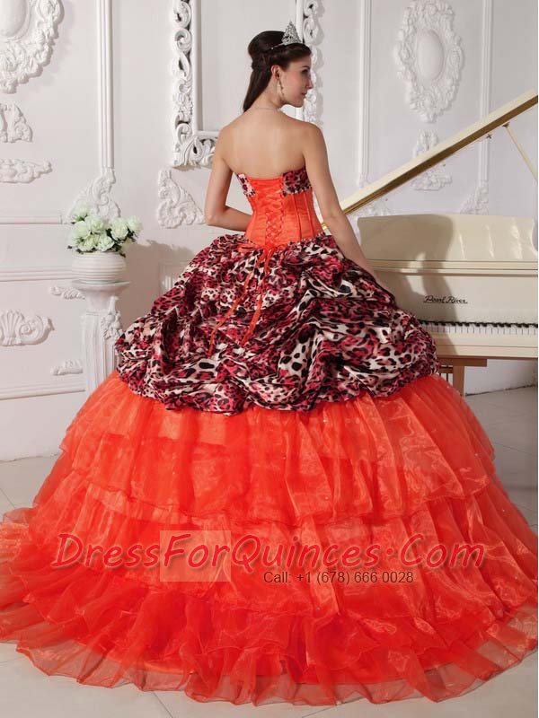 Sweetheart Ball Gown Orange Red Leopard and Organza Appliques and Beadings Spring Quinceanera Dresses