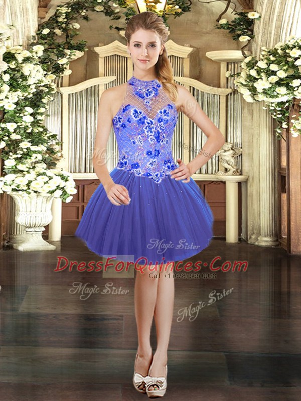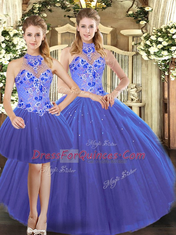 Three Pieces Quince Ball Gowns Blue Halter Top Sleeveless Floor Length Lace Up