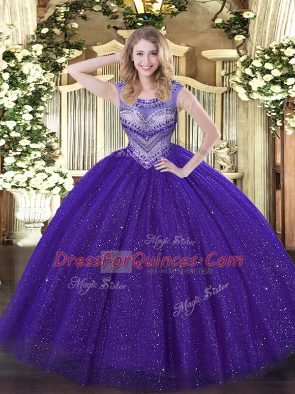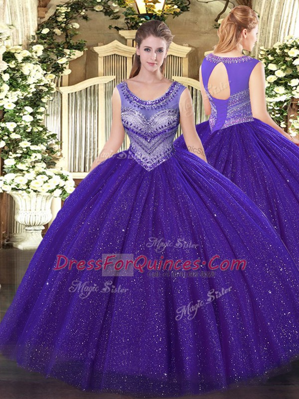 Tulle and Sequined Sleeveless Floor Length Ball Gown Prom Dress and Beading