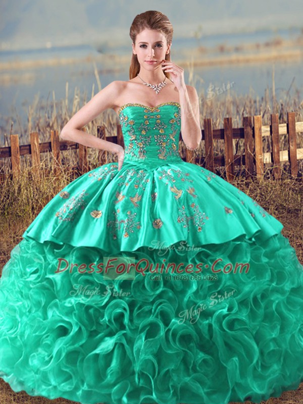Turquoise Sleeveless Fabric With Rolling Flowers Brush Train Lace Up Quinceanera Dress for Sweet 16 and Quinceanera