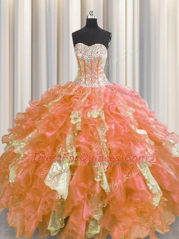Unique Visible Boning Organza and Sequined Sweetheart Sleeveless Lace Up Beading and Ruffles and Sequins Sweet 16 Dresses in Multi-color