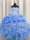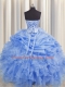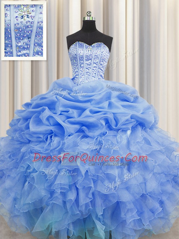 Visible Boning Blue Organza Lace Up Sweetheart Sleeveless Floor Length Ball Gown Prom Dress Beading and Ruffles and Pick Ups