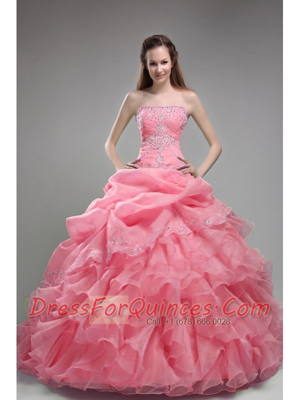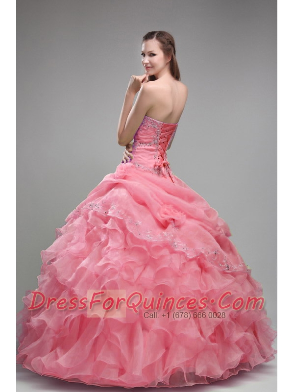Watermelon Ball Gown Sweet-heart Floor-length Orangza Quinceanera Dress With Beading and Ruffles