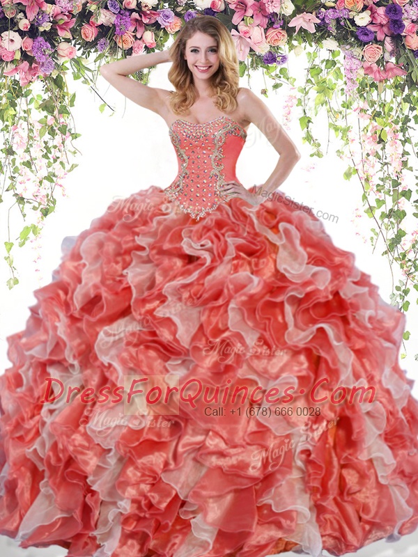White And Red Organza Lace Up Sweetheart Sleeveless Floor Length Quinceanera Gowns Beading and Ruffles