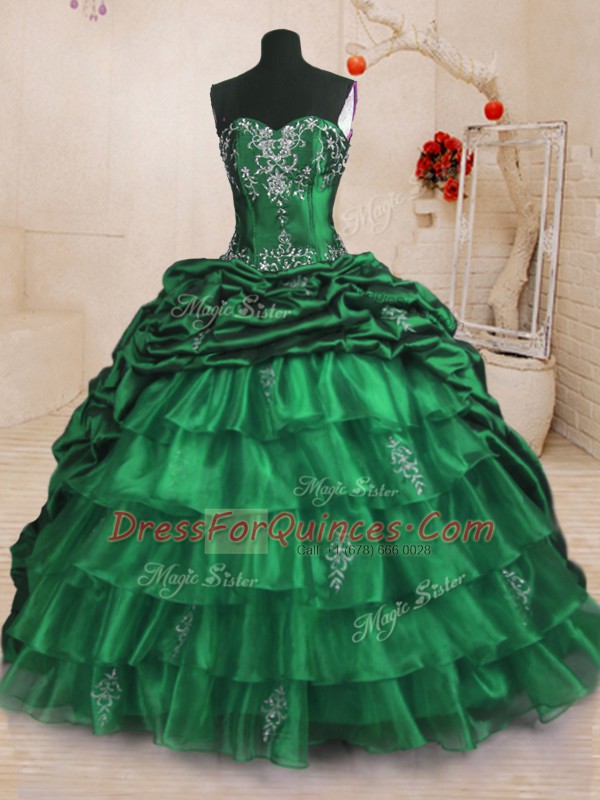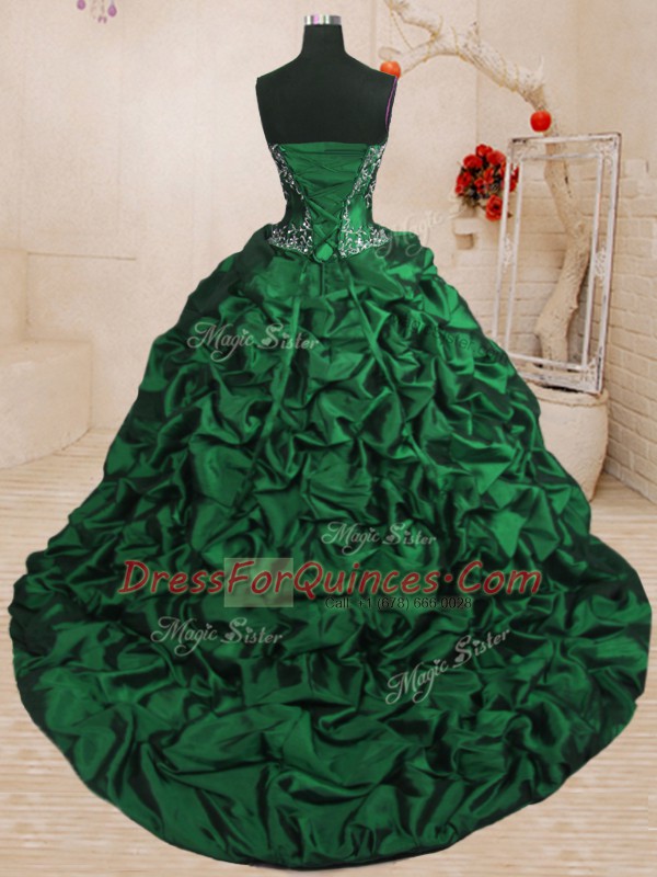 With Train Lace Up Quinceanera Gowns Dark Green for Military Ball and Sweet 16 and Quinceanera with Beading and Appliques and Ruffled Layers and Pick Ups Sweep Train