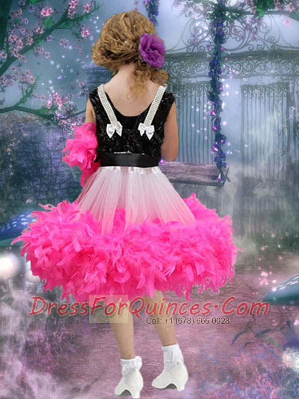 2014 Rose Pink A-Line Knee-length Ruffles and Hand Made Flowers Little Girl Dress with Scoop
