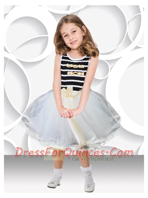 2014 White and Black Short Scoop Little Girl Dress with Bowknot