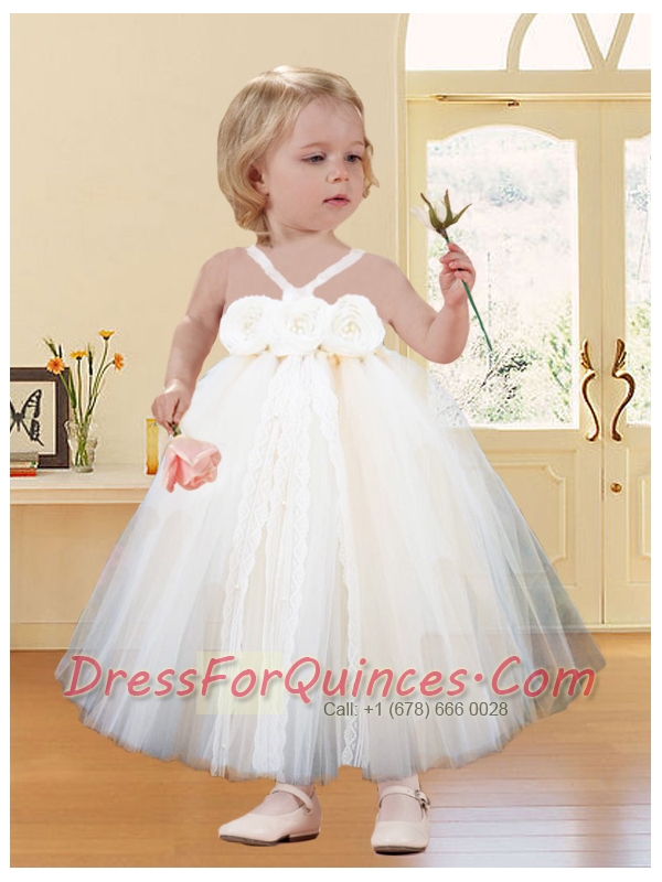 Champagne A-Line Halter Top Tulle Little Girl Dress with Hand Made Flowers